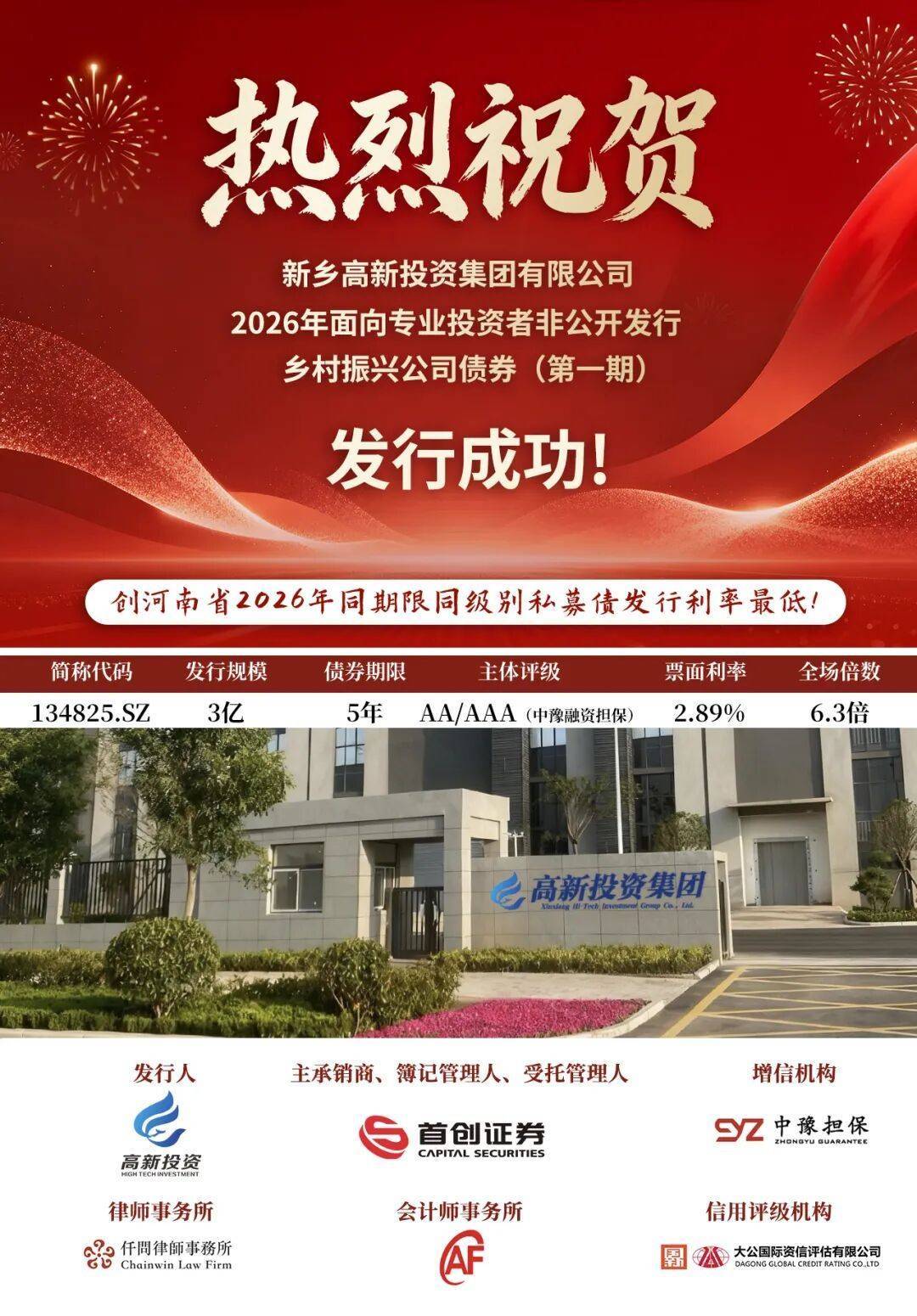 【大河财立方消息】近日,新乡高新投资集团有限公司(简称新乡高新投资集团)2026年面向专业投资者非公开发行乡村振兴公司债券(第一期)完成发行。本次债券发行规模3亿元,期限5年,票面利率2.89%,获6.3倍超额认购,创下河南省2026年同期限同级别私募债发行利率最低纪录。