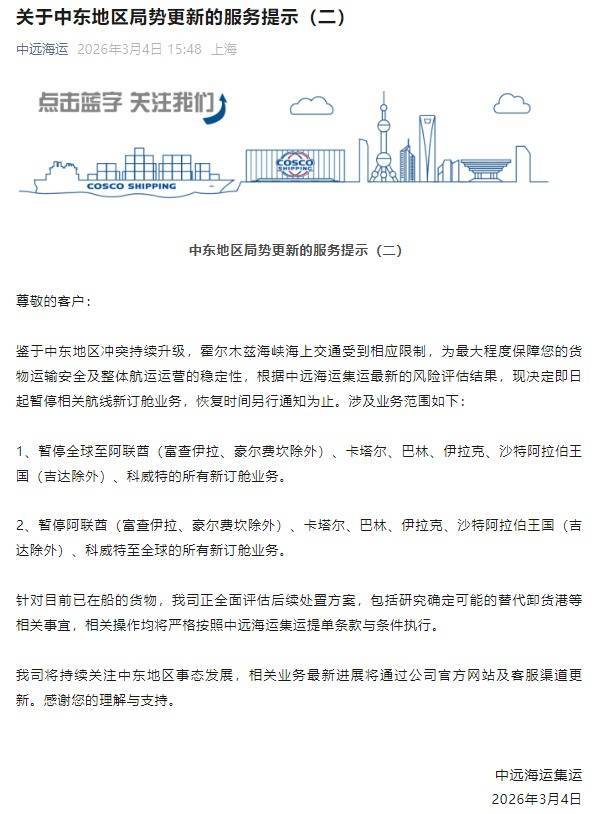 3月4日十大股票配资公司,“中远海运”发布中东地区局势更新的服务提示: