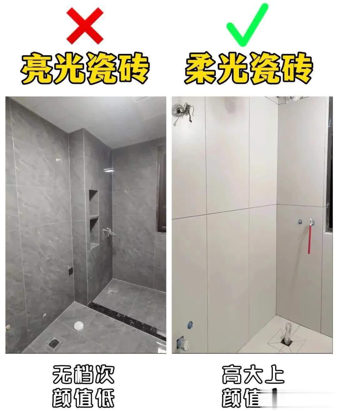 7. 亮光瓷砖❌ vs 柔光瓷砖✅土味瞬间:亮光瓷砖像贴了镜子!灯光一照全是倒影,人影晃来晃去眼都花了,low到像公共厕所!