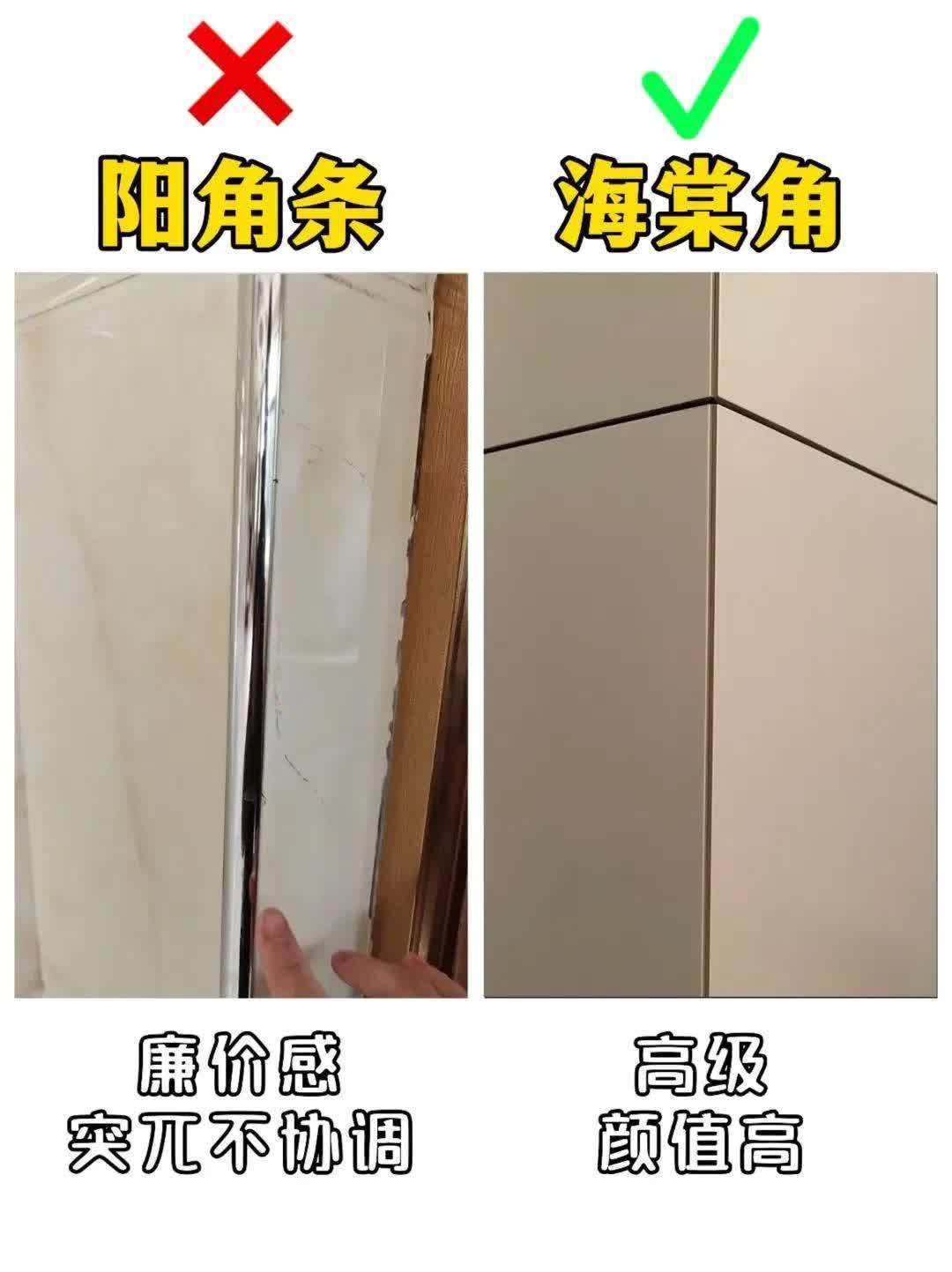 1. 阳角条❌ vs 海棠角✅丑点暴击:阳角条金属边外露,廉价感爆棚,装墙上像贴了塑料条,跟瓷砖格格不入!