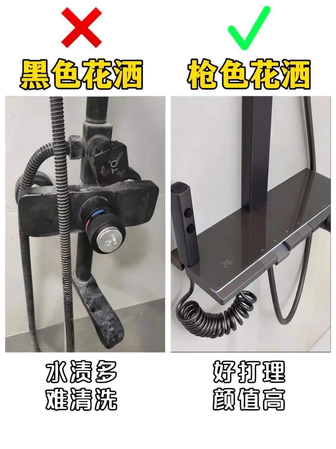 2. 黑色花洒❌ vs 枪灰色花洒✅踩雷现场:黑色花洒简直是水渍收集器!喷头上全是白花花的水垢,擦完又留印,清洁到崩溃!