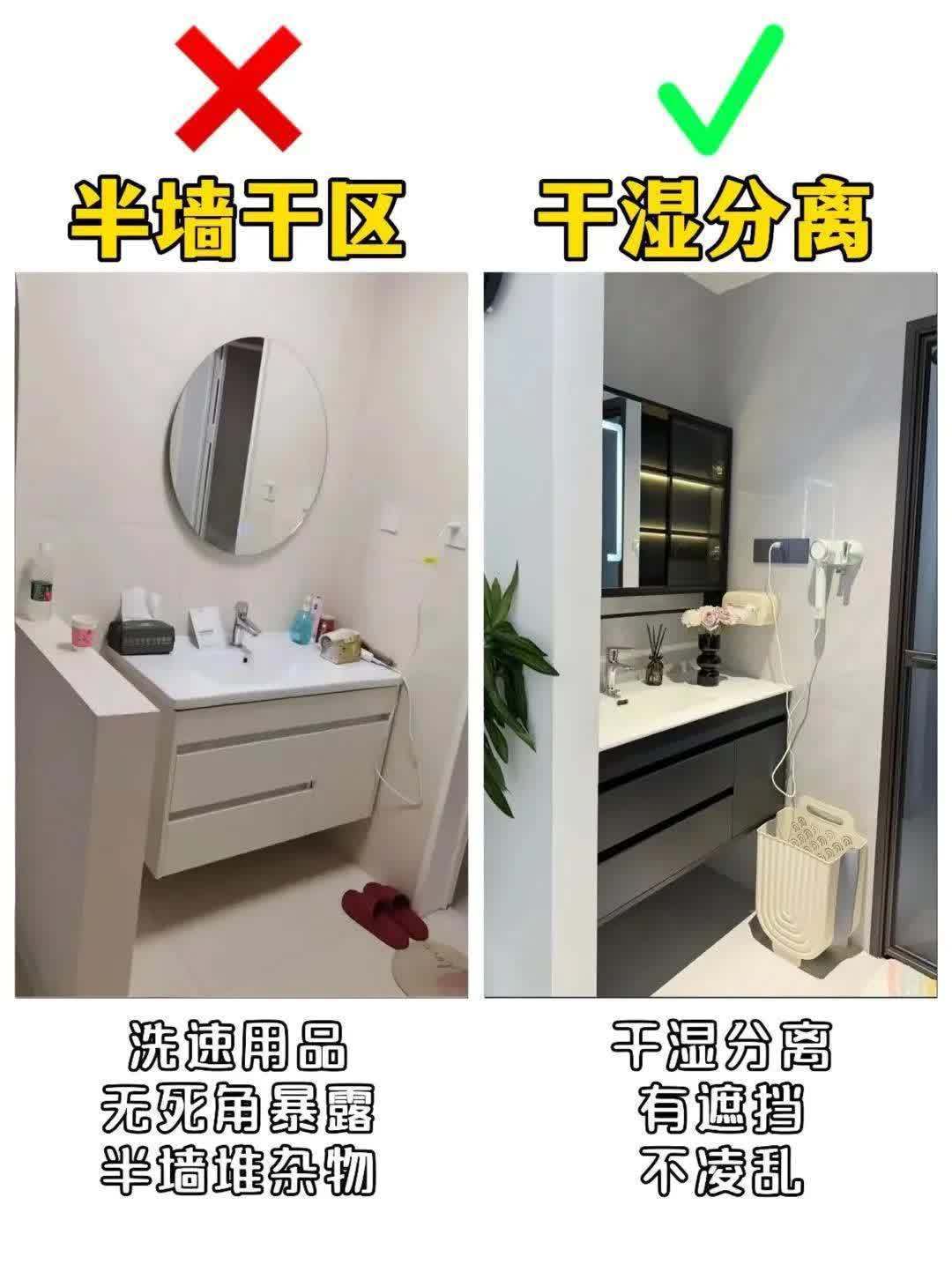 4. 半墙干区❌ vs 全墙干湿分离✅翻车现场:半墙设计就是“杂物收集器”!洗发水、牙杯堆得满当当,看着比菜市场还乱!