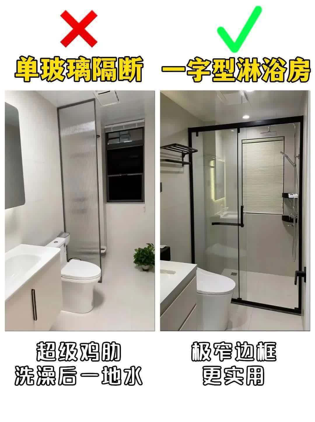 5. 单玻璃隔断❌ vs 一字型淋浴房✅鸡肋实锤:单玻璃隔断挡不住水花!洗个澡满地都是水,踩上去生怕滑倒,清洁还得擦整个卫生间!