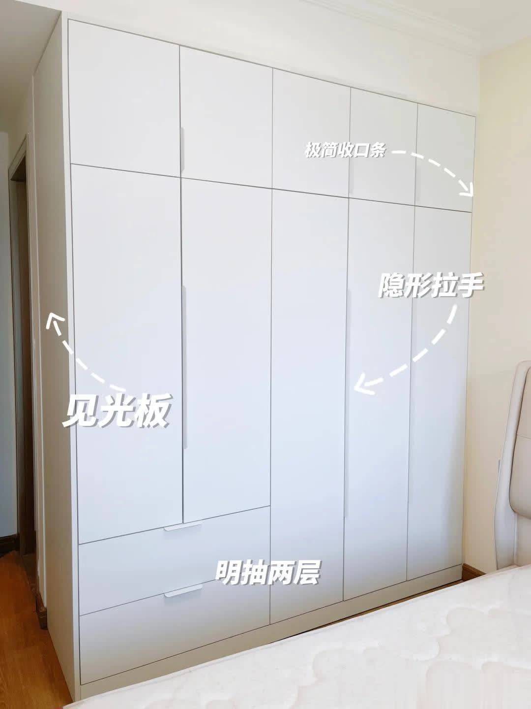 建议衣柜等采用到顶设计,可避免衣柜和墙壁形成死角,增加打扫难度。