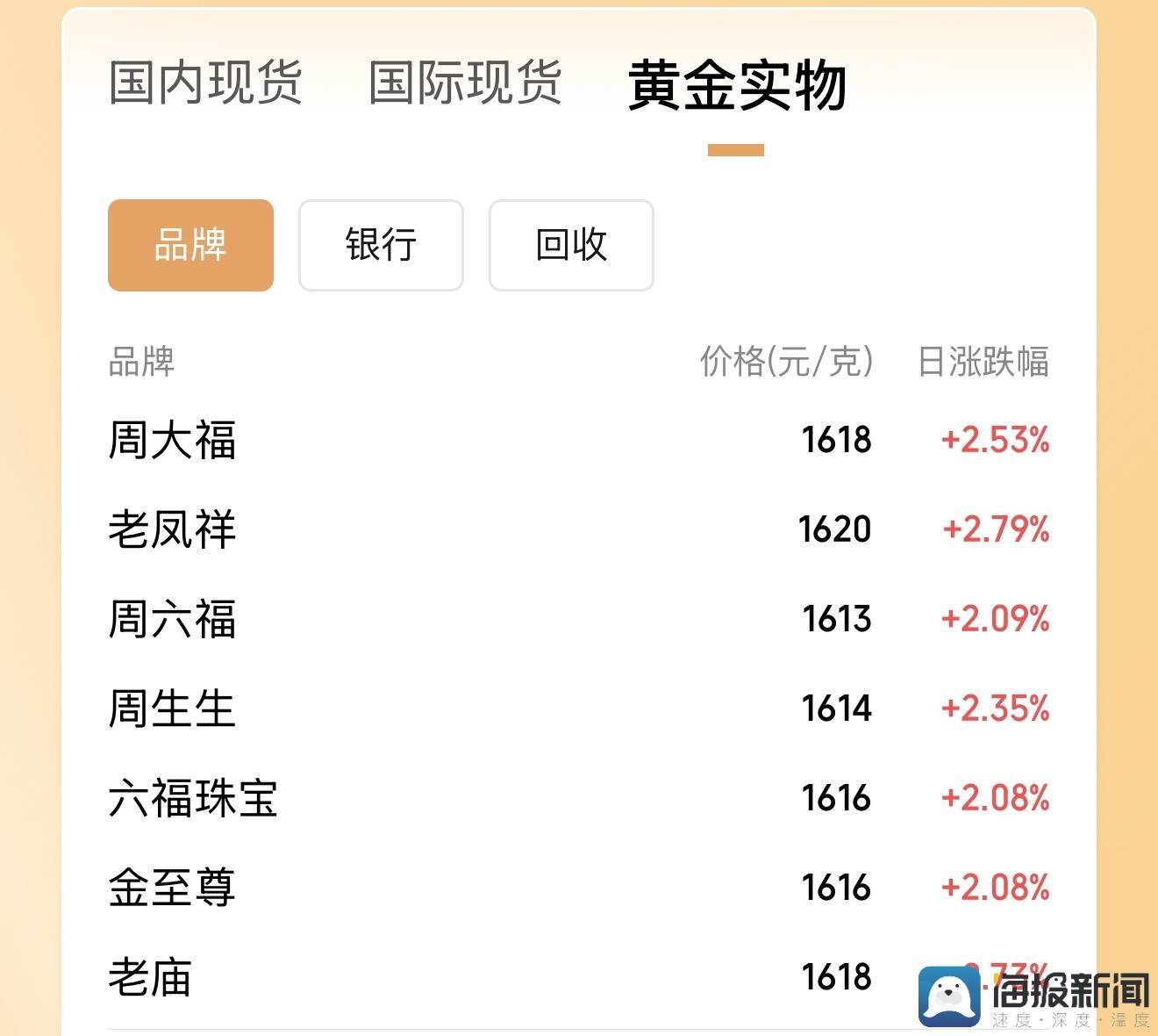 当日,多家黄金珠宝品牌大幅上调其足金首饰价格,多数品牌的金饰价格突破1600元/克。其中,周生生报价1614元/克,周大福报价1618元/克,老庙黄金报价1618元/克,老凤祥报价1620元/克,中国黄金报价1616元/克。