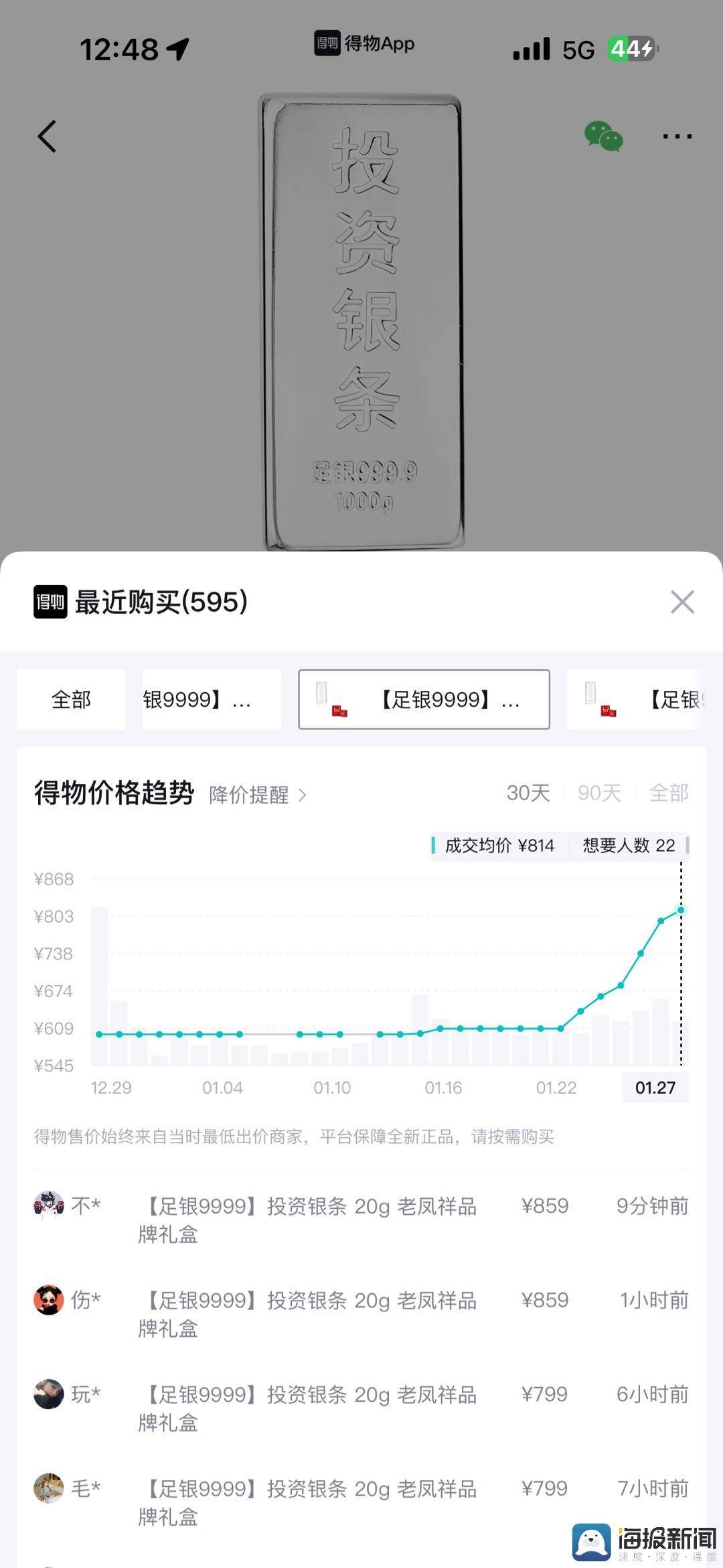 得物App数据显示,投资银条价格近一周飙涨41%,价格涨幅大幅领先于投资金条。