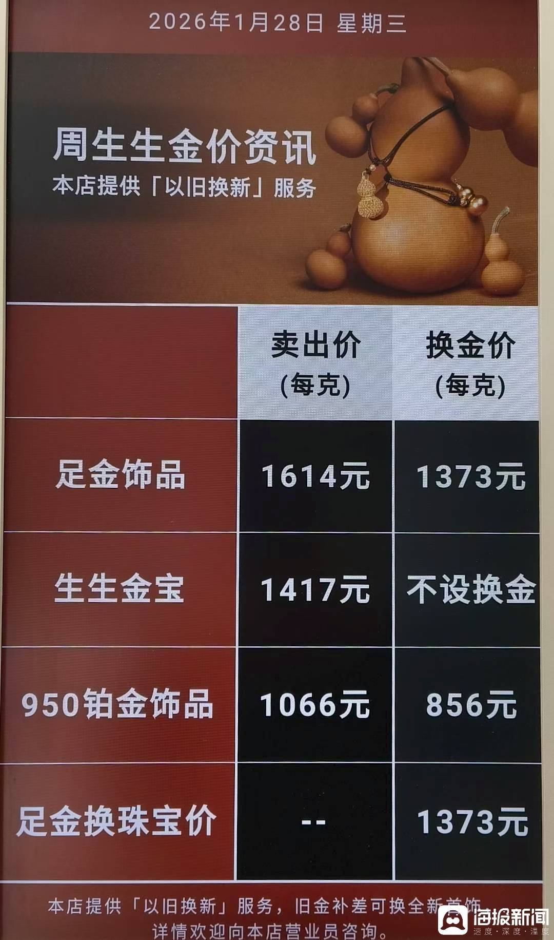 记者走访看到,1月28日,周生生品牌金饰单价已涨至1614元/克。