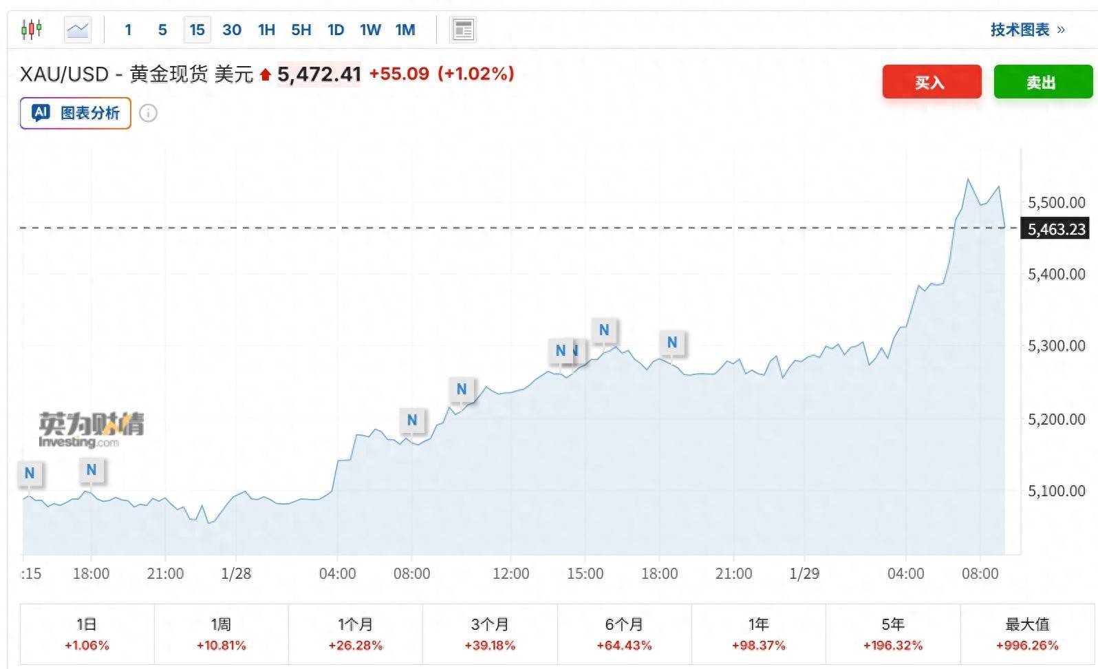 智通财经APP获悉,现货黄金价格在冲高逼近5600美元后出现回落武汉股票配资公司,截至发稿,金价涨1.02%,报5472.41美元/盎司,刷新历史最高纪录,延续了此前因市场预期货币宽松政策、资金大规模撤离主权债券及传统货币体系所引发的强劲涨势,形成令人瞩目的持续上行态势。