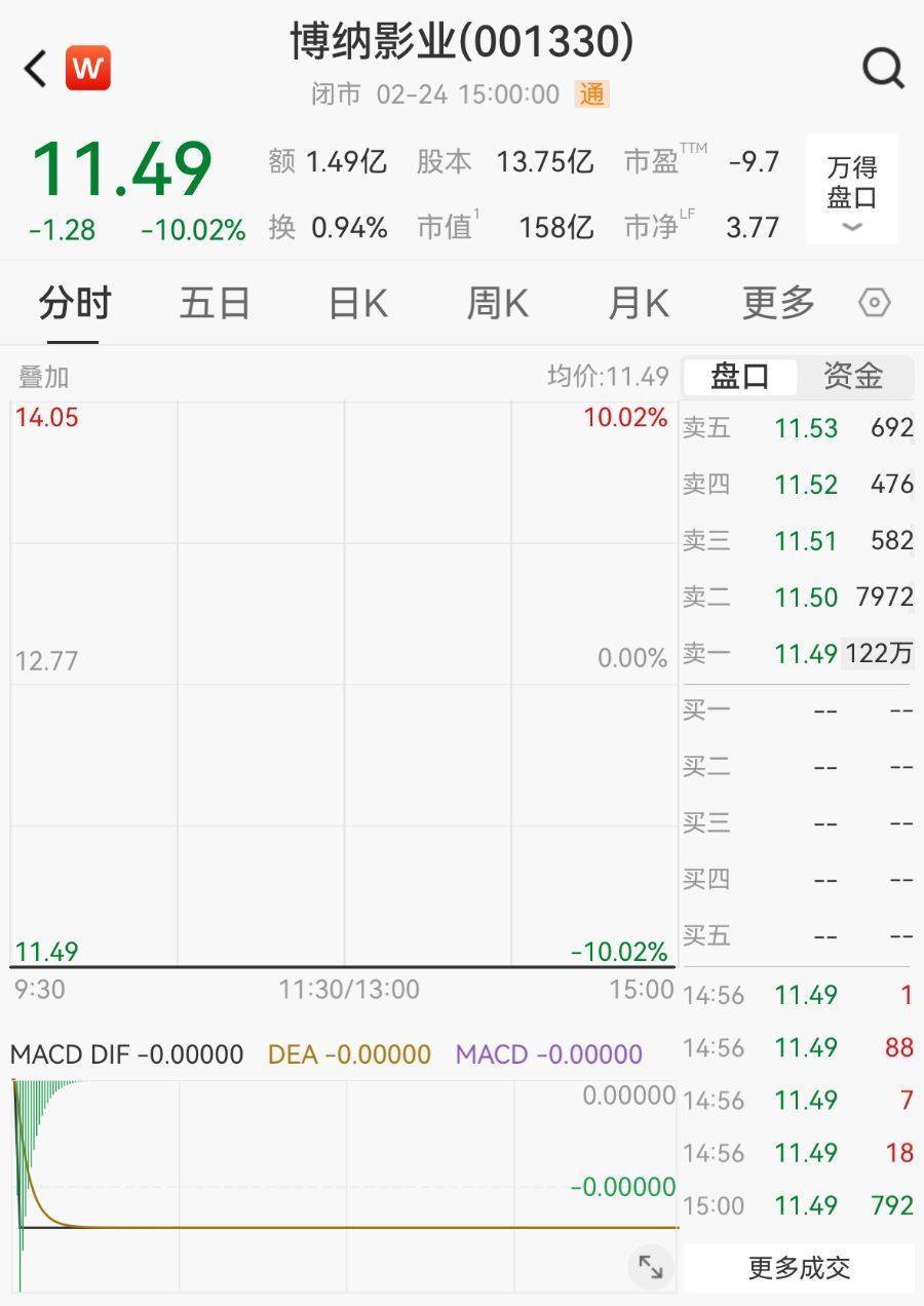 2月24日,A股影视院线板块显著降温,博纳影业“一”字跌停,报11.49元/股,总市值为157.9亿元,“卖一”封单超120万手。