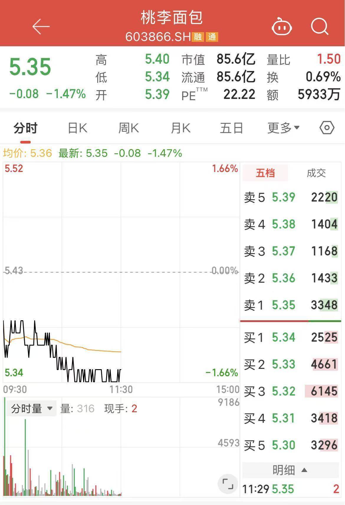 2月26日,有着"面包第一股"之称的桃李面包(603866.SH)股价震荡走低配资公司电话,截至午盘,报5.35元/股,跌幅1.47%,总市值已不足百亿元。