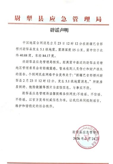 经尉犁县应急管理局核实,目前未造成人员伤亡和财产损失。网传“房屋倒塌”“抢险救援”等图片与实际情况不符。