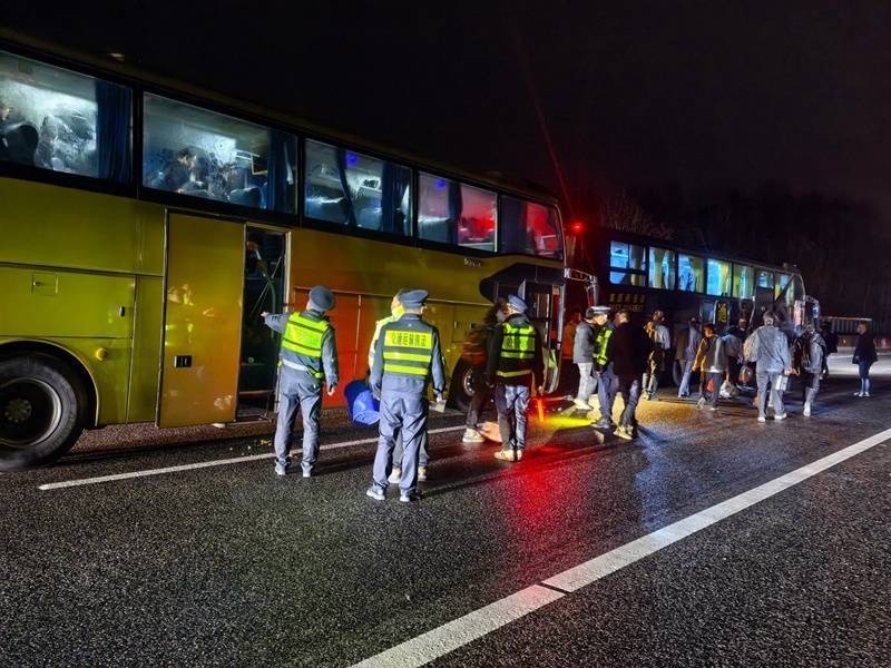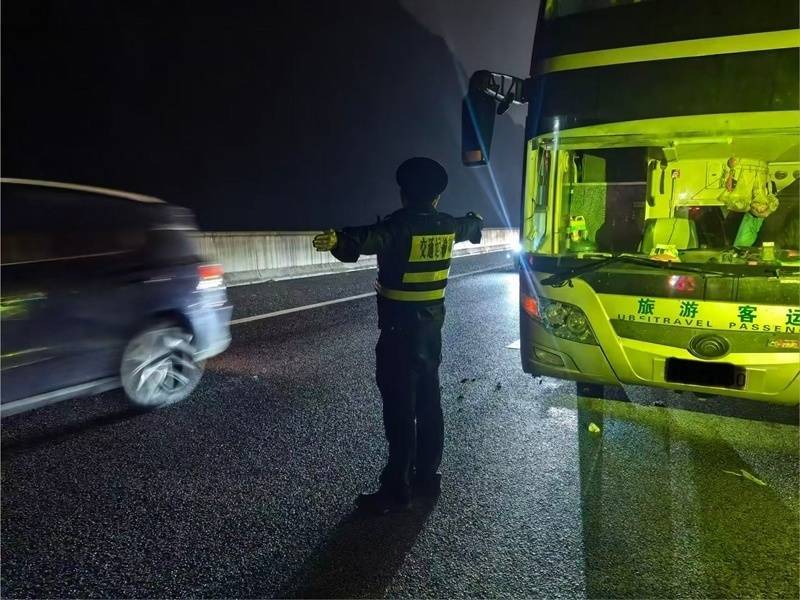 执法人员抵达现场后,立即启动应急处置流程,迅速分工开展救援工作,筑牢安全防线。在安全布控方面,执法人员在故障车后方规范设置警示标志和反光锥桶,开启警灯警报,引导过往车辆减速避让,有效防范二次事故发生;在人员守护方面,第一时间将全车乘客有序疏散至高速公路护栏外安全区域,耐心安抚乘客情绪,实时通报处置进展,重点为老年乘客、儿童提供帮扶,缓解大家的焦虑;在联动处置方面,快速协调施救单位与客运企业,调派转运车辆接送乘客,同步联系拖车对故障客车进行清障拖离,全程跟进转运和清障进度,确保每一位乘客都能安全有序换乘。